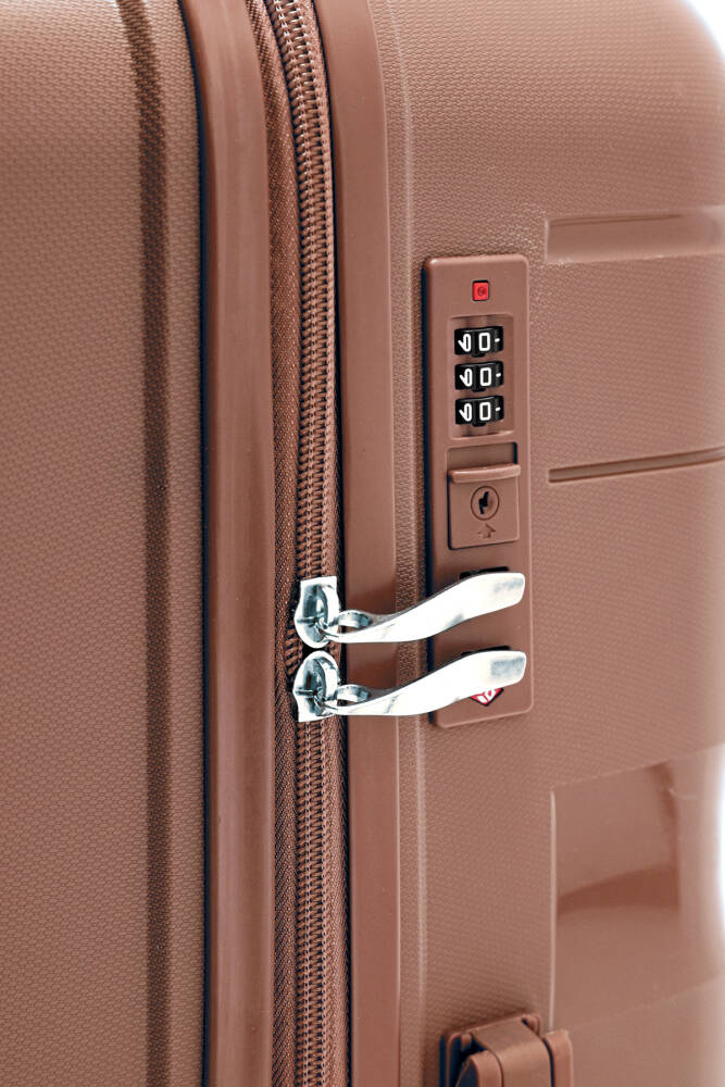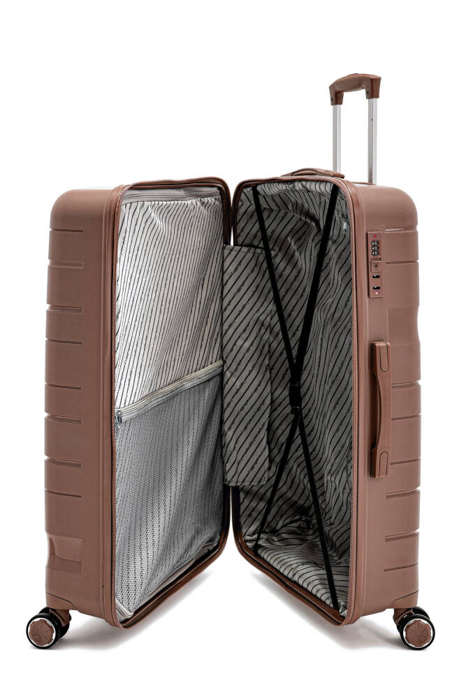 Malzeme: %100 Polipropilen (PP) – Darbelere ve çizilmelere karşı dayanıklı. Tekerlek: 360° dönebilen, sessiz, çift tekerlek sistemi ile kolay taşınabilir. Gövde: Esnek ve kırılmaz gövde yapısı. Kilit Sistemi: TSA onaylı şifreli kilit – Uluslararası seyahatler için güvenli. Çekçek Kolu: Dayanıklı, ayarlanabilir alüminyum teleskopik kol. Taşıma Kolları: Üst ve yan ergonomik tutma kolları. İç Bölme: Fermuarlı ara bölme ve lastikli sabitleme kayışları ile düzenli kullanım. Tasarım: Şık ve modern görünüm, farklı renk seçenekleri ile her zevke uygun. Kullanım Alanı: Uzun yolculuklar ve tatiller için geniş hacimli kullanım.
