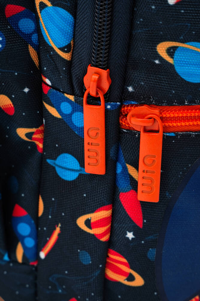 Çift fermuarlı ön akseuar cebi; kalemlik, resim malzemeleri ( sulu boya, kuru boya, pastel boya vb.) ve okul araç gereçleri için tasarlanmıştır